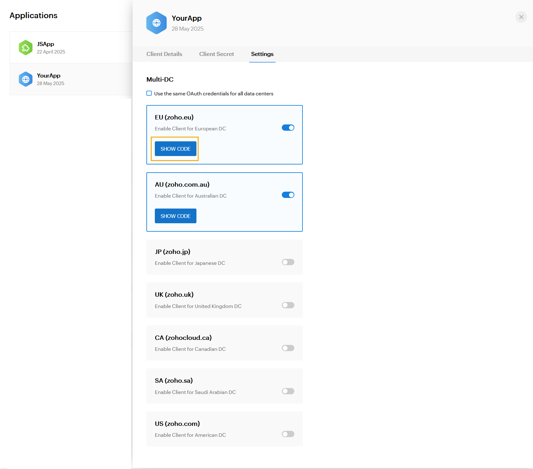 To enable Multi-DC settings, go to the Zoho API console, select the client application you want to grant multi-dc access, and then navigate to the Settings tab. Within the Settings tab, toggle the slider next to the required data center to enable.
