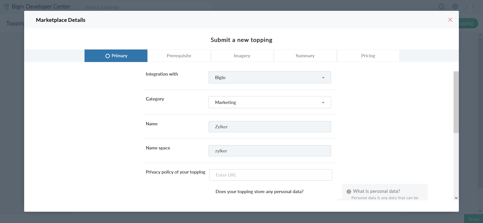 Once you have completed the development of your topping, you can publish the topping and make it publicly available to all Bigin customers by listing it on Bigin Marketplace. However, first you must submit your topping for review process, and then clear the process to get your topping listed on the Bigin Marketplace.